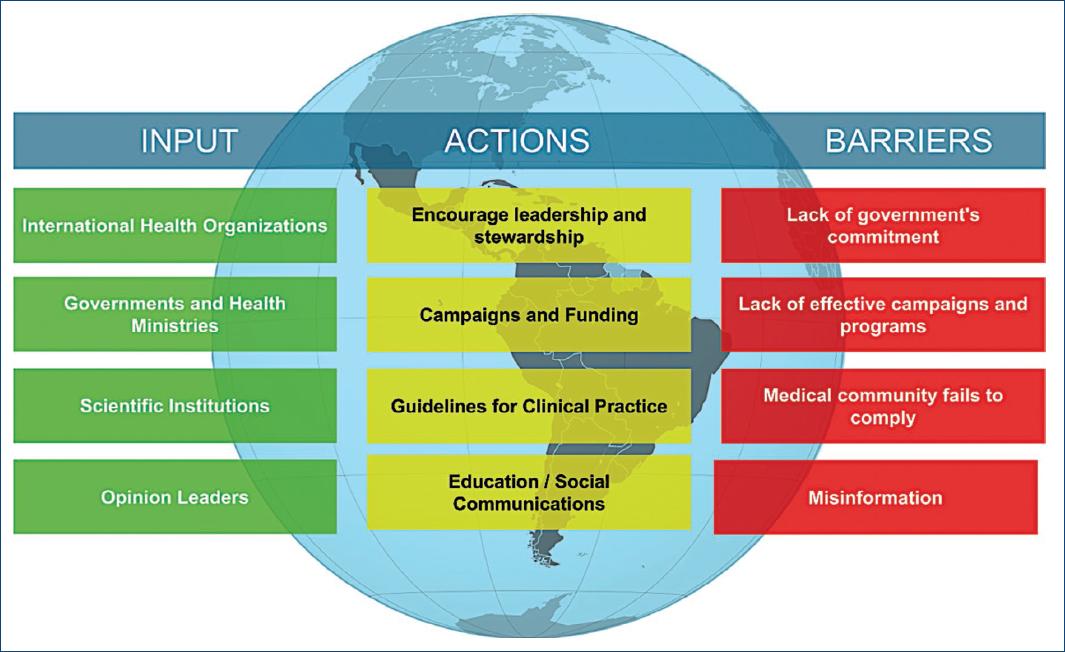 Evidence has shown that influenza vaccination (IV) and pneumococcus vaccination (PV) are associated with a reduction in the rate of several CV outcomes, such as myocardial infarction (MI), heart failure (HF) hospitalization, and CV mortality7-17. However, several challenges have been identified in the implementation of these prevention strategies. These challenges include patient decisions (vaccine hesitancy, previous experience, and misinformation), healthcare providers' knowledge and attitudes toward vaccination, and healthcare system barriers. All these factors contribute to lower-than-expected immunization rates in Latin America and globally18-28.