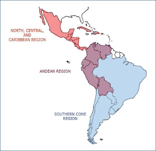 Figure 2 Distribution of participating countries by region. North, Central, and Caribbean region (NCC): Mexico, Guatemala, El Salvador, Honduras, Nicaragua, Costa Rica, Panama, Cuba, Puerto Rico and Dominican Republic. Andean region (AR): Venezuela, Colombia, Ecuador, Bolivia and Peru. Southern Cone region (SCR): Paraguay, Chile, Uruguay, and Argentina.
