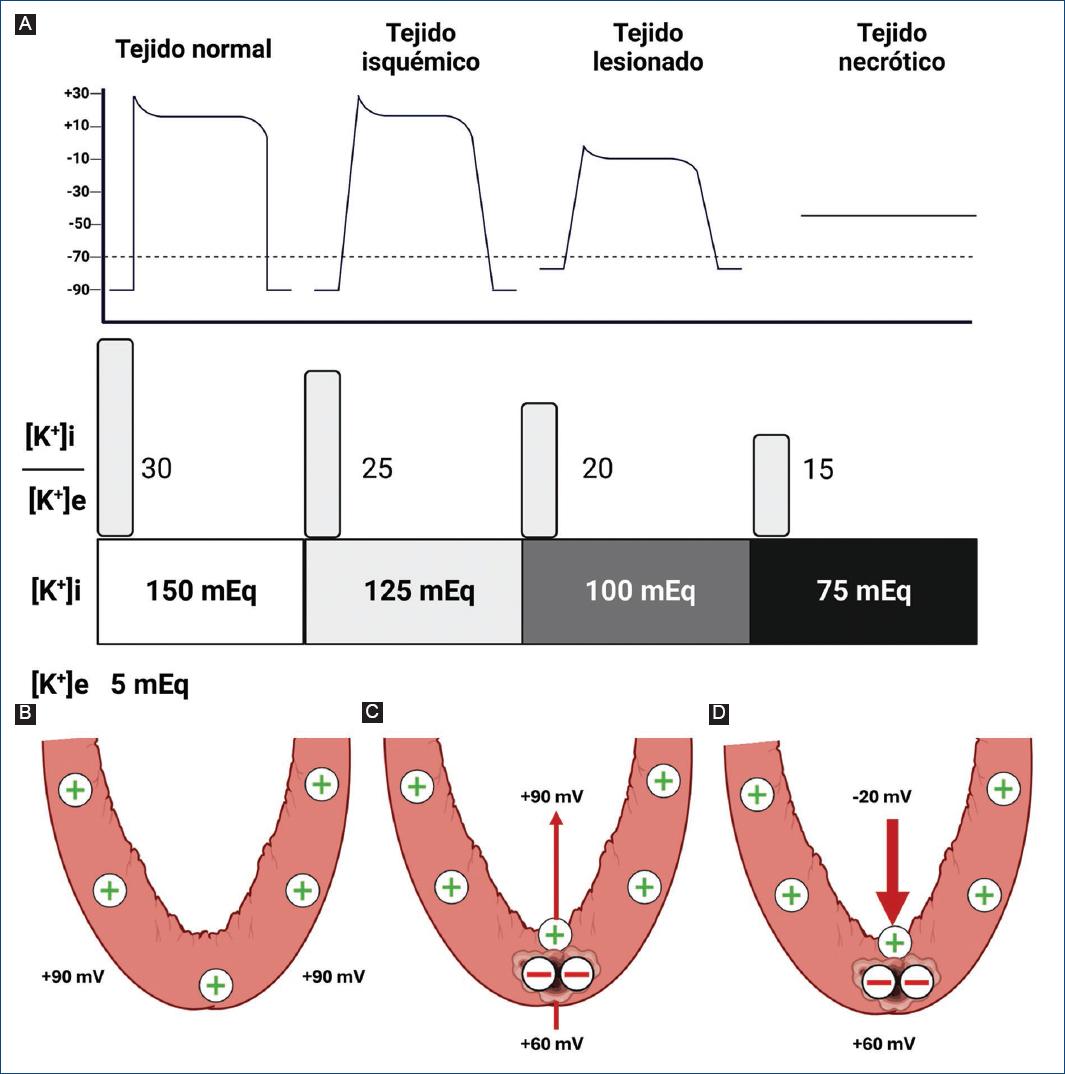Figura 1 A: diferentes grados de despolarización diastólica en tejido normal, isquémico, lesionado y necrótico, comparado con la relación de potasio intra- y extracelular. Nótese que cuanto más se reduce la relación [K+i]/[K+e], más despolarización diastólica presenta el tejido, acercándose primero al potencial umbral (aumento del automatismo) hasta superarlo (pérdida de la excitabilidad). En la parte inferior, la imagen muestra los potenciales de membrana poniendo el 0 en el espacio intracelular y como positivo el extracelular. En el sano (B), el potencial de membrana es de 90mV. En diástole (C), la célula lesionada no puede repolarizarse por completo y es menos positiva que el tejido sano (corriente de lesión diastólica de 30 mV). Cuando se produce la despolarización (D), la zona sana se vuelve intensamente negativa respecto a la lesionada y se produce una corriente sistólica de lesión hacia la zona lesionada (80 mV). Al llegar a la diástole eléctrica, las polaridades vuelven a cambiar en la zona sana y se vuelve a la posición B (reinicio de la corriente diastólica de lesión).