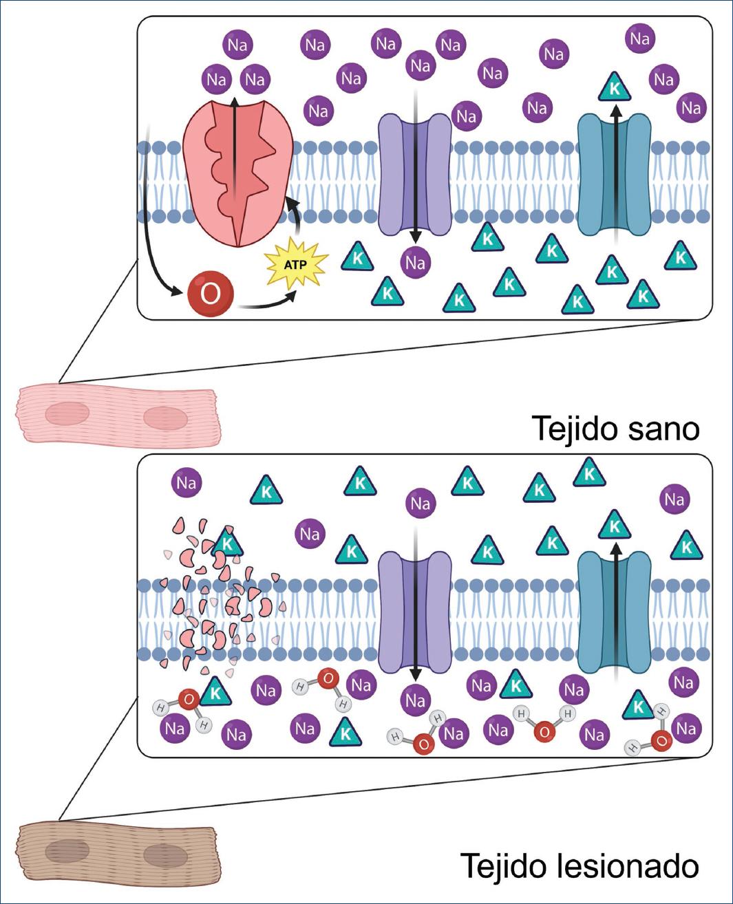 Figura 2 Actividad de la ATPasa de Na+/K+ y los canales iónicos de Na+ y K+ en tejido sano y lesionado.