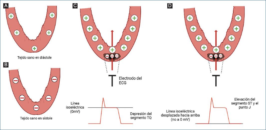 Figura 3 A: tejido sano durante la diástole, con cargas positivas en el medio extracelular. B: tejido sano en sístole, con cargas negativas en el medio extracelular. C: las zonas de lesión presentan una despolarización diastólica parcial (no puede repolarizarse adecuadamente), lo que hace que se genere un dipolo respecto al tejido sano. En este caso, sin corrección, la derivación electrocardiográfica mostrará una depresión del segmento TQ donde el electrodo explorador «verá» cómo el vector eléctrico se aleja de sí, mientras que el punto J permanece en su línea isoeléctrica original (0 mV). D: la corrección de la depresión TQ por los nuevos electrocardiógrafos produce una elevación del punto J y el segmento ST, sugiriendo erróneamente que es una alteración que ocurre solo en la sístole eléctrica.