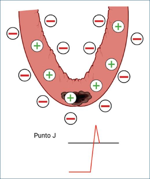Según el concepto de que el tejido lesionado presenta una despolarización diastólica parcial, se asume que al final de la fase 0 del potencial de acción, es decir, al término de la despolarización, tanto el tejido isquémico como el sano se encontrarían con el mismo voltaje (+20 mV, por ejemplo), lo cual coincide con el punto J del ECG (Fig. 4)1,3,5,6. Es importante recordar que los autores que se adhieren a esta hipótesis no conceden importancia a la corriente de lesión sistólica porque la consideran un artefacto producido por la corrección a cero del infradesnivel TQ.