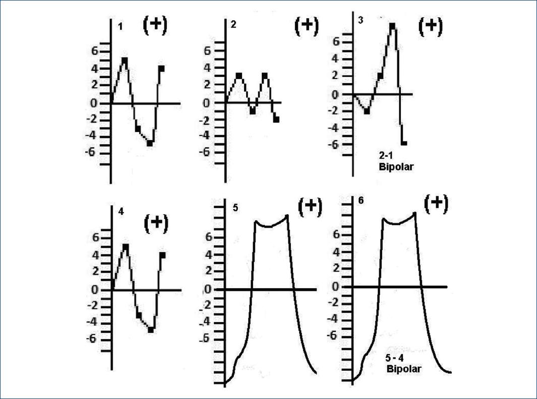 Figura 5 1, 2 y 3: antes de la lesión miocárdica. 4, 5 y 6: después de la lesión. 1 y 4: electrodo unipolar en la base. 2 y 5: electrodo unipolar en el ápex. 3 y 6: bipolar creada restando el trazado de la zona sana del de la zona lesionada (hay que recordar que, en la resta, lo que es positivo se hace negativo). Se observa que el electrodo que explora la zona no lesionada (basal) no registra mayores cambios con la lesión, mientras que el del ápex muestra una corriente negativa diastólica y una positiva, sostenida, sistólica. La amplitud eléctrica de las señales de la zona apexiana es mayor que las de la zona sana, lo que se refleja en la bipolar.