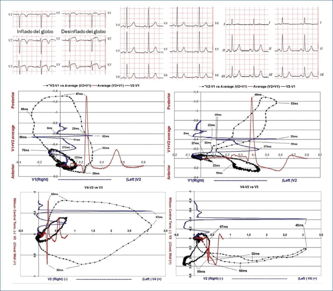 Figura 6 Mujer de 46 años, antes y después del inflado de un balón en la arteria descendente anterior proximal. Se muestran los registros basales del electrocardiograma estándar y los bucles transversos de la derivación bipolar precordial V2-V1 (en azul) frente a la derivación promedio ponderada V1+V2 (en rojo) y V4-V2 frente a la unipolar V3. Además, se representan los registros durante la isquemia inducida por el inflado del balón en la arteria descendente anterior proximal. Se observa un cambio especular del bucle a los 32 ms con rotación de antihoraria a horaria, lo que desplaza las fuerzas eléctricas hacia la izquierda y adelante. La reducción del voltaje en la onda S (de −0.7 mV a −0.4 mV) genera un desplazamiento del punto J hacia estas posiciones, con un inicio anómalo de la repolarización.