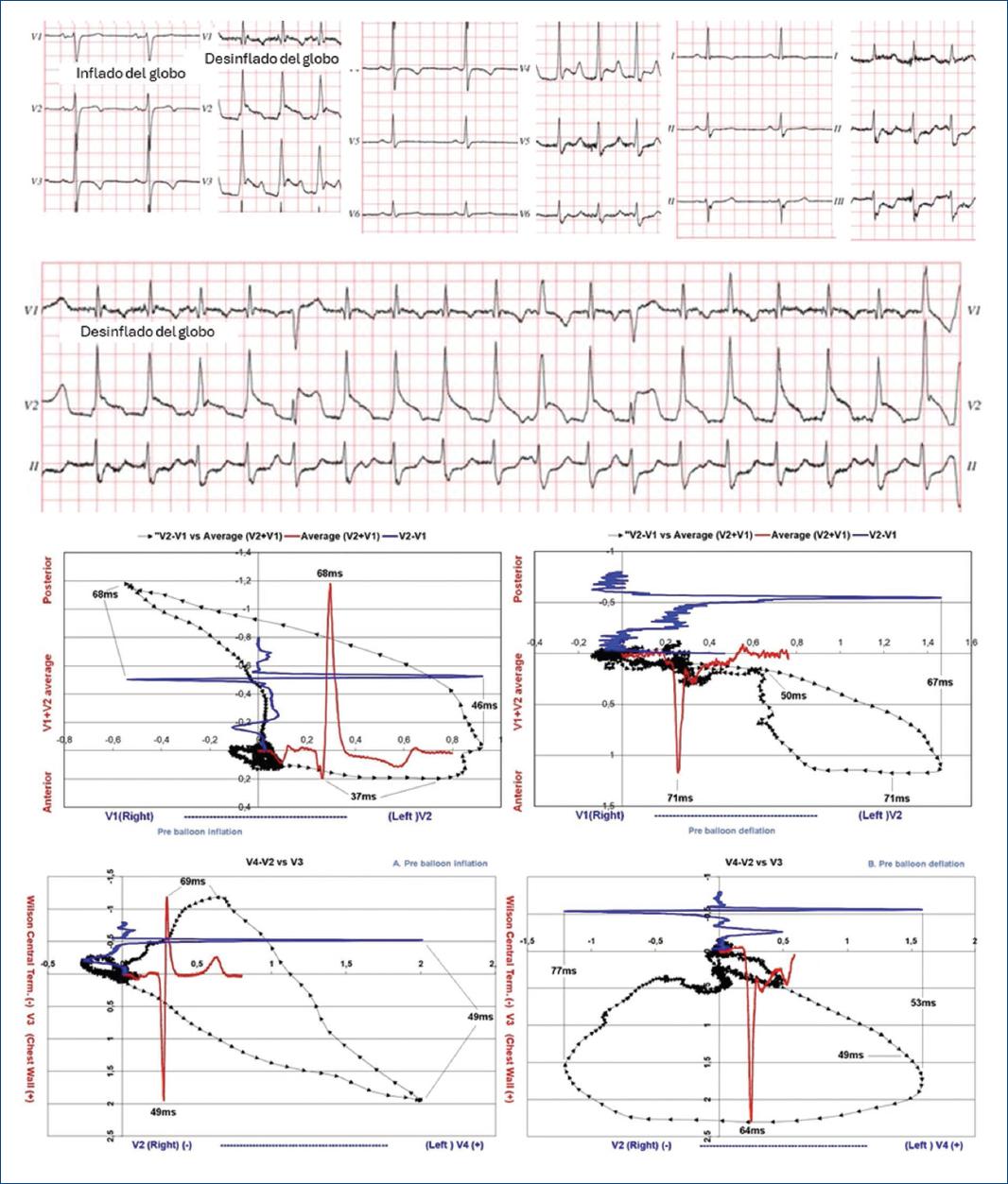 Figura 7 Varón de 51 años, antes y después del inflado de un balón en la arteria descendente anterior proximal. Se presentan los registros basales del electrocardiograma estándar y los bucles transversos de la derivación bipolar precordial V2-V1 (en azul) frente a la derivación promedio ponderada V1+V2 (en rojo) y V4-V2 frente a la unipolar V3. El bucle muestra un plegamiento hacia delante y a la izquierda, con un cambio en las fuerzas eléctricas finales que desplaza el punto J hacia estas posiciones. Es de notar que el pico de la onda R de la bipolar V2-V1 basal, que se daba a los 46 ms, se produce en la isquemia a los 67 ms (21 ms más tarde). Si bien esto podría sugerir un bloqueo de conducción intramiocárdico, la desaparición isquémica de la onda S de esta bipolar (que en el basal se daba a los 68 ms) puede indicar que solo se trata de una inversión del vector, sin que necesariamente se deba a un bloqueo de conducción intramiocárdico. Lo mismo ocurre con la onda S de la unipolar estándar V3. Estos cambios reflejan la influencia de las corrientes de lesión en el segmento ST y en la dinámica del bucle de despolarización.