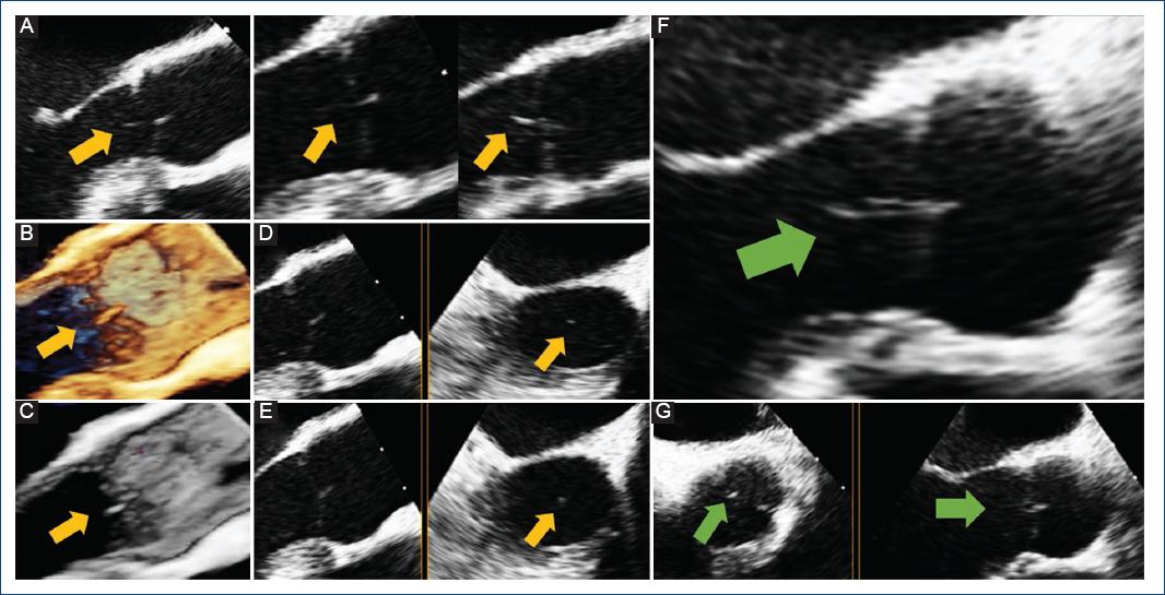 Figure 1 TEE shows Lambl’s excrescence on the aortic valve. Initial TEE (yellow arrow): A: mid-esophageal long axis view depicting a filamentous structure attached to the ventricle surface of the aortic valve; B and C: 3-D reconstruction; D and E: mid-esophageal long axis view in X-plane mode demonstrating the mobile structure in the left ventricular outflow tract. Follow-up TEE, 6 months later, showing no change in the linear mobile structure (green arrow): F: mid-esophageal long-axis view and G: mid-esophageal aortic valve short-axis view in X-plane mode. TEE: transesophageal echocardiogram.