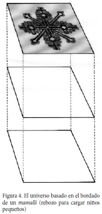 La forma del universo es representada en los bordados de los textiles y en el papel ceremonial, figuras comparables con las que registran los códices y otros materiales precolombinos. (figs. 4 y 5). Algunos altares domésticos están construidos bajo esta idea, dispuestos sobre una tarima que consta de dos planchas. La parte de arriba señala el cielo y en ella se colocan las divinidades autóctonas, imágenes cristianas y objetos del rito; en medio se localiza otra plancha que simboliza la parte terrestre, donde depositan el incensario y algunas ofrendas; el inframundo es señalado con el piso en donde está clavada la tarima cuadrangular.