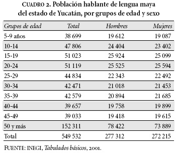 El estado de Yucatán concentra a la mayor parte de la población indígena de la península.11 En 1990, los hablantes de maya mayores de cinco años sumaron 525 264 personas, y en 2000 ascendieron a 549 532. Con el criterio exclusivo de la lengua, la población indígena del estado representaba en 2000 el 37.31% del total de los habitantes de la entidad mayores de cinco años, considerados en 1 472 683 personas.12