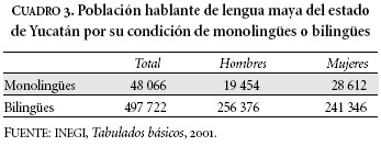 14 El número de monolingües mayas en el estado, en el año 2000, fue de 48 066 personas; los bilingües ascendieron a 497 722 (INEGI, 2001).