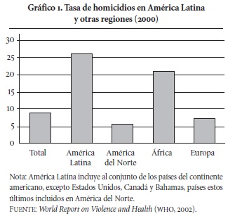 Al comienzo del nuevo siglo la violencia, particularmente urbana, ha alcanzado dimensiones que permiten definirla como una nueva pandemia social en la región. Según datos de la Organización Panamericana de la Salud (OPS) (1996), entre 1984 y 1994 la tasa de homicidios en América Latina creció 44.0%, y para el año 2000, de acuerdo con un reporte mundial reciente sobre violencia y salud (WHO, 2002), esta región se constituyó en la más violenta del mundo con 27.5 homicidios por cada 100 000 habitantes (véase gráfico 1). Además, en el continente se encuentran algunos de los países más violentos del mundo, como lo son Colombia y El Salvador. Estos datos, aunque impactantes, sólo nos permiten comenzar a ver la magnitud de un problema social con múltiples dimensiones.