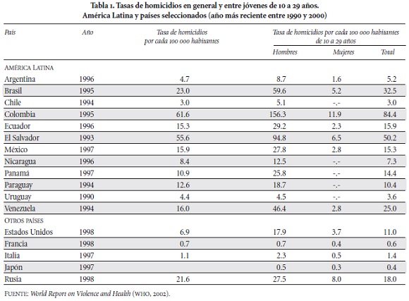 Como se mencionó anteriormente, América Latina es la región con la tasa de homicidios más alta en el mundo, y también lo es cuando consideramos la población de 10 a 29 años de edad. Las disparidades, de por sí significativas, resultan alarmantes en este caso: en Europa Occidental los jóvenes son víctimas de 0.9 homicidios por cada 100 000 habitantes, en África la tasa es de 17.6 por cada 100 000, pero en nuestra región asciende a 36.4 víctimas de homicidios por cada 100 000 jóvenes. En algunos países, como Colombia y Venezuela, las tasas de homicidios entre los jóvenes crecieron vertiginosamente en los últimos años (159% y 132% respectivamente entre 1984 y 1994). Cómo se observa en la tabla 1, existen nuevamente importantes disparidades intrarregionales, con Colombia, El Salvador, Brasil y Venezuela destacándose con tasas muy altas de homicidios juveniles; países del cono sur (Argentina, Chile y Uruguay) con tasas bajas, y otros países como México, Ecuador y Panamá con niveles intermedios, siempre en términos relativos a la región.2