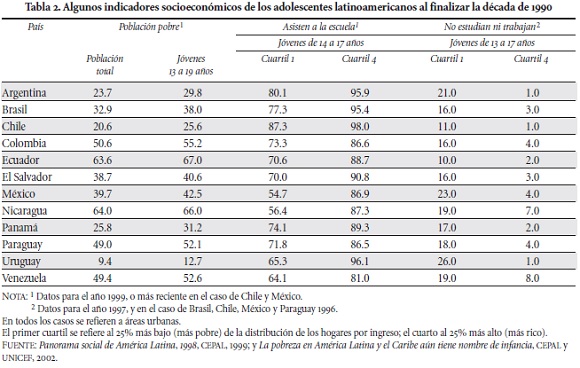 En la tabla 2 se presentan algunos pocos indicadores socioeconómicos de los adolescentes latinoamericanos. En el primer apartado de este artículo se mencionaba que el incremento de la violencia urbana en la región tenía a los jóvenes como a uno de sus principales protagonistas. Sin embargo, no es sólo en la violencia en que los jóvenes se ven particularmente afectados. La tabla 2 intenta sugerir que igualmente los jóvenes padecen con particular intensidad la pobreza y la exclusión de canales tradicionales de socialización e integración social.