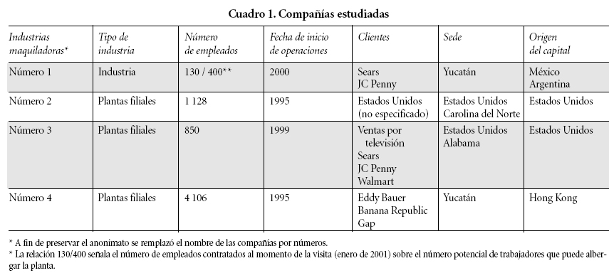 A continuación se presenta una revisión detallada de los factores específicos que entre 2000 y 2005 han contribuido a retener el capital extranjero en Yucatán. La información se recopiló a partir de observaciones de campo, hechas en ese periodo, y más de 50 entrevistas con trabajadores de cuatro plantas maquiladoras de Yucatán, realizadas en 2001. Dichas entrevistas formaron parte de una investigación para una tesis de doctorado y fueron aplicadas a miembros de las élites locales, trabajadores de la industria maquiladora de todos los niveles del proceso productivo (incluyendo a gerentes) y a algunos de sus familiares. Las observaciones más recientes son de mayo de 2005 y se sustentan en nuevas entrevistas, lo que permitió dar seguimiento al desarrollo maquilador entre 20012005. Los entrevistados provienen de cuatro plantas maquiladoras de ropa localizadas en dos ciudades medianas, Motul e Izamal, situadas en la región ex henequenera de Yucatán, al noroeste de la península. Dos de estas plantas producían exclusivamente pantalones de mezclilla, mientras que el resto fabricaba ropa interior y para niños. Siguiendo la clasificación de García de Fuentes y Morales (2000), tres de las cuatro plantas eran consideradas grandes, ya que empleaban a 900 trabajadores o más, y la otra era mediana (de 100 a 900 empleados).