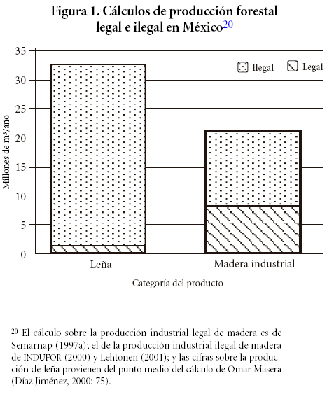 20 El cálculo sobre la producción industrial legal de madera es de Semarnap (1997a); el de la producción industrial ilegal de madera de INDUFOR (2000) y Lehtonen (2001); y las cifras sobre la producción de leña provienen del punto medio del cálculo de Omar Masera (Díaz Jiménez, 2000: 75).