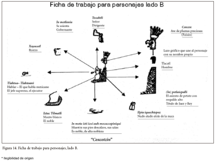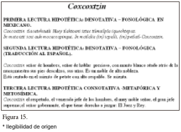 4. Elaboración de una primera lectura fonológica-denotativa y sintáctica de cada grupo para reconstruir oraciones y/o párrafos del texto en náhuatl y establecer su traducción al español que corresponden a las asociaciones plásticas de los elementos mínimos.