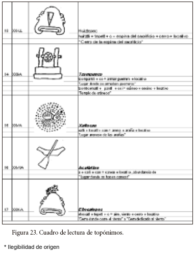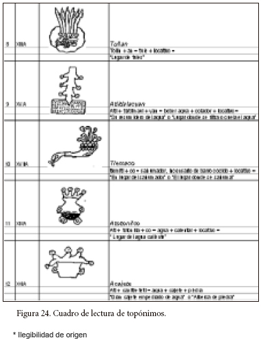 22 Caso contrario es el del glifo que muchos estudiosos marcan como Aztlán, que literalmente significa lugar de garzas, pero el glifo no refiere plásticamente ningún elemento de la garza, lo cual nos permite inferir dos premisas: a) el glifo no transcribe el nombre de Aztlán, y b) la historia que narra este documento no inicia en este mítico lugar.