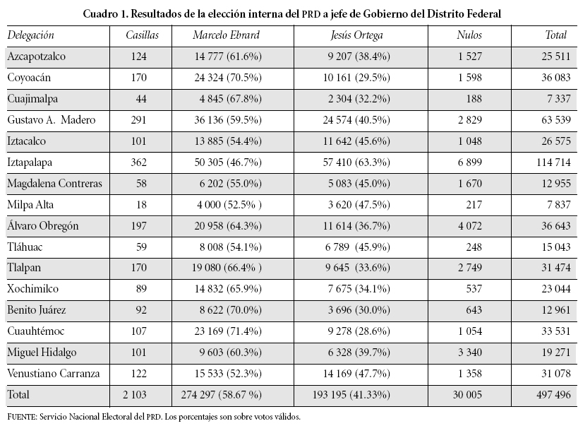 Al día siguiente, el Sistema Nacional Electoral confirmó el triunfo de Ebrard con un poco más de 17 puntos porcentuales: 58.67% contra 41.33% (274 297 sufragios contra 193 195 de Ortega). Además, ganó en 15 de las 16 delegaciones de la ciudad; sólo perdió en Iztapalapa por unos siete mil votos. En las delegaciones Cuauhtémoc, Coyoacán y Benito Juárez, la victoria de Ebrard fue con más de 70% de los votos. El promedio de participación por casilla fue de 250 personas9 (véase cuadro 1, p. 114).