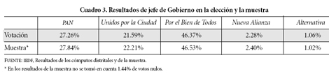 Los resultados oficiales de la elección nos ofrecen una idea muy nítida de la presencia de las fuerzas políticas en la ciudad, donde la supremacía de la Coalición por el Bien de Todos es abrumadora, ya que ésta obtuvo uno de cada dos de los votos emitidos. Aun con la disminución en la elección de jefe de Gobierno, la posición mayoritaria de la Coalición en la entidad nunca estuvo realmente en riesgo. El PAN alcanzó una cuarta parte de los votos (un poco más en la elección de jefe de Gobierno), mientras la coalición PRI-PVEM se quedó muy atrás, con uno de cada ocho votos. También es significativo que los dos nuevos partidos políticos hayan logrado tener presencia en la Asamblea Legislativa.