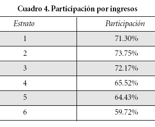 En primer término resulta que, tal y como se aprecia en el cuadro 4 (p. 119), las áreas de la ciudad en las que se ubican los tres niveles de ingresos más altos tuvieron una participación por encima de los tres niveles más bajos.