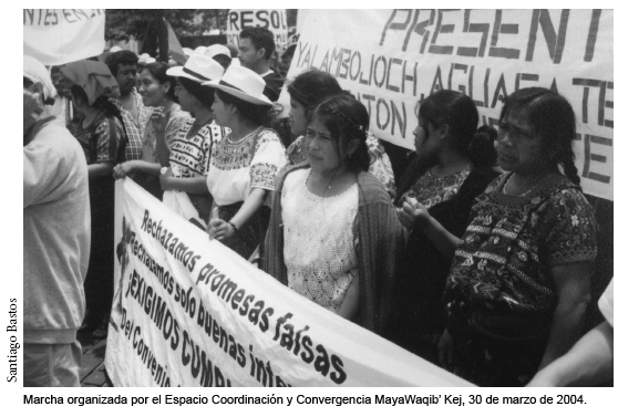 Los movimientos indígenas y el maya en particular surgen para luchar contra esa ausencia de reconocimiento de su existencia, pero la desigualdad basada en la diferencia sí se daba de hecho. En unos primeros momentos, las demandas fueron sobre todo en contra de esa desigualdad, por vía de los reclamos campesinos, aún dentro del paradigma clasista de la modernidad (Bastos y Camus, 2003). Pero surgieron cada vez más voces que reclamaban el reconocimiento ala existencia de unos rasgos culturales propios, que estaban en peligro de desaparecer a causa de las políticas de asimilación y las acciones de discriminación.