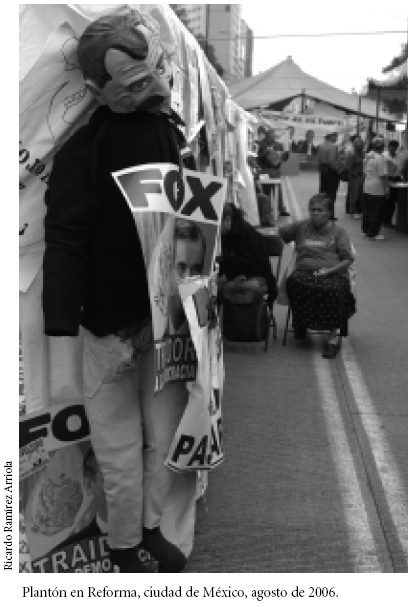 25 Luis Hernández Navarro, "Vallas y policías", La Jornada, 23 de agosto de 2006. El artículo concluye: "Vicente Fox terminará los 99 días que le restan a su mandato escondido de las multitudes, protegido por el Estado Mayor Presidencial (EMP). De consumarse la imposición de Felipe Calderón, el nuevo mandatario tendrá que gobernar de la misma manera: protegido por vallas, militares, tanquetas y policías".