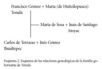 Según los documentos mencionados, entre 1581 y 1585, don Carlos de Terrazas, en representación de su fallecida esposa Inés, sostuvo un pleito con don Juan de Santiago, quien, a su vez, representaba a su esposa, otra hija de don Francisco Gómez, llamada doña María de Sosa. El pleito entre los concuños trató sobre la herencia de don Francisco Gómez (véase esquema 2), que incluía las salinas que hemos comentado antes y que se describen como "mucha hacienda, muchas sementeras e casas e tunales de grana y muchas suertes de piletes en que se cuaja la sal". Por lo tanto, supongo ahora que el don Juan que aparece como señor de Atoyac en el lienzo es don Juan de Santiago, el concuño de don Carlos de Terrazas41.