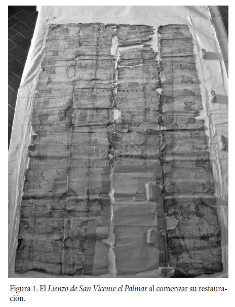 El Lienzo de San Vicente el Palmar fue visto por Mary Elizabeth Smith, la pareja Welte y Ross Parmenter durante un viaje al pueblo en 198214. Smith localizó además una copia del documento en el archivo de la Secretaría de la Reforma Agraria en Oaxaca. Impulsada por su interés en esta copia, Laura Rodríguez Cano comenzó un estudio descriptivo del lienzo y de los otros documentos del grupo en 200015. Como consecuencia de sus gestiones, el lienzo original (fig. 1) está actualmente en restauración en el taller del Centro Cultural Santo Domingo en Oaxaca16.