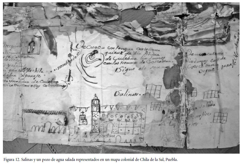 En la nómina de los pueblos sujetos llaman la atención los dos pueblos de salinas mencionados al principio de la lista: San Bartolomé Xoxouqui Iztapan ('salinas verdes') y San Pedro Cuezcoma Iztapan ('salinas del coscomate')32. Su posición en el listado se debe quizás a su importancia económica para el señorío. La sal era un producto muy valioso que se comercializaba en una extensa región33. Hasta hoy día, estos dos pueblos, junto con Santa María y San Ildefonso, siguen produciendo sal de acuerdo con los métodos prehispánicos (fig. 9, p. 106)34. La antigüedad de la producción de sal es evidente: por ejemplo, en San Bartolo, un sitio arqueológico corona el espectacular paisaje surrealista de los manantiales salados y sus depósitos de minerales (fig. 10)35.