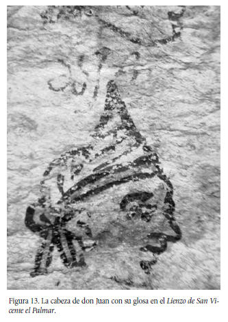 47 Sin embargo, no fue posible identificarla en la documentación que he consultado. Desafortunadamente, tampoco queda clara la relación de don Juan con los gobernantes dibujados en el centro del documento. En el Lienzo de San Vicente, el antecesor de don Juan parece ya haber tenido un nombre católico (en la glosa muy destruida parece leerse donag [ustin]), pero los nombres de muchos de sus ancestros más antiguos resultan ilegibles.