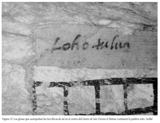 ¿A qué pleito, o mejor dicho, acuerdo sobre salinas se refiere el Lienzo de San Vicente el Palmar? La identificación del señorío representado en la parte superior no se puede lograr por medio del nombre del gobernante que encabeza el grupo debajo de la iglesia, ya que la glosa solamente nos da el nombre don Juan (fig. 13, p. 110). La falta de un apellido nos imposibilita identificar a este señor en los documentos del siglo XVI. Sin embargo, debajo de la cabeza de don Juan se ve un topograma semidestruido que consiste en un valle del cual brota un chorro de agua. Al lado se encuentra una glosa casi ilegible cuya última parte se puede leer como [...] tayu yuta caánu, 'señorío del río grande' (fig. 14, p. 110). Este es el nombre mixteco de San Pedro Atoyac, hoy una pequeñísima comunidad de apenas 400 habitantes, pero que en el siglo XVI era un señorío colindante con Ihualtepec por el oriente y ubicado en las márgenes del río Mixteco38. Los registros coloniales sugieren que este señorío estaba relacionado con el de Tonalá39. Si proyectamos las identificaciones propuestas en este trabajo en un mapa actual (mapa 4, p. 112), se nota la coincidencia con la composición general del Lienzo de San Vicente el Palmar. Por lo mismo, parto de la idea de que el señorío en la parte superior del lienzo representa a San Pedro Atoyac. Esta hipótesis deriva en otra: la relación espacial entre el Cerro de Tortillas y las salinas (mapa 4, p. 112) sugiere que se trata de las fincas de Santa María (la capilla a la derecha) y San Ildefonso (la capilla a la izquierda). Éstas son las dos salinas no incluidas en la antes mencionada lista de 1598, lo cual es quizás significativo: San Pedro y San Bartolo parecen haber sido parte indiscutible del señorío, pero sobre Santa María y San Ildefonso pudo haber existido alguna duda. Cada capilla o población está asociada a dos fincas de sal. Las tres fincas de sal en el centro podrían representar fincas pertenecientes a los nobles (¿de Ihualtepec?), ya que las glosas asociadas con ellas comienzan con toho, que es la palabra para 'noble' (fig. 15). Así se entiende la ausencia de una capilla relacionada con estas fincas. Los puntos negros asociados con las fincas podrían indicar el número de manantiales salados que las abastecen o podrían representar alguna medida de su productividad.