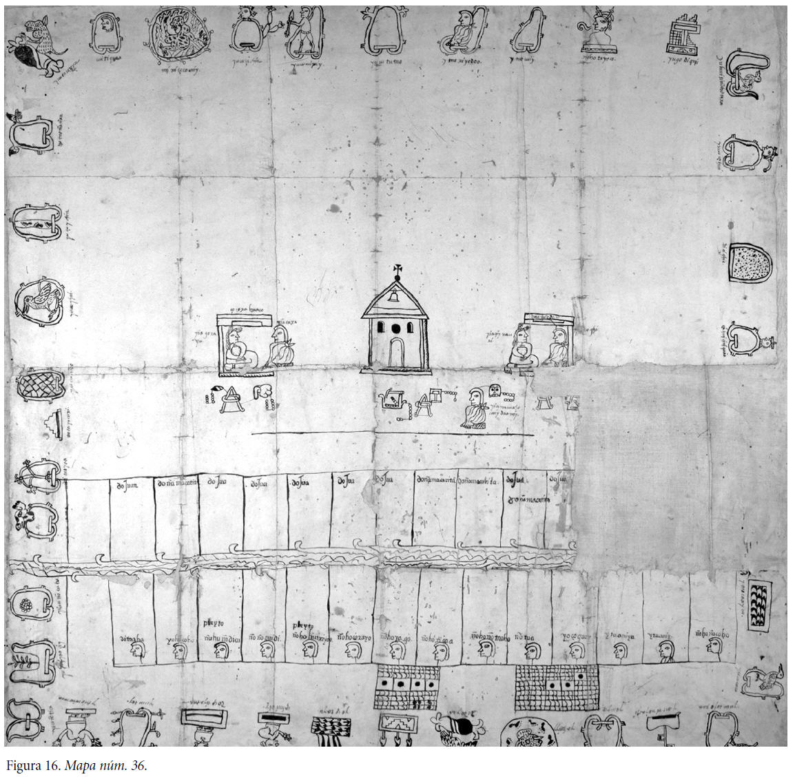 La identificación del origen del Lienzo de San Vicente el Palmar tiene también consecuencias para otros documentos pictográficos del grupo comentado al inicio de este texto: el Mapa núm. 36 (fig. 16, p. 114) y su pariente, el Lienzo Mixteco III (fig. 18, p. 116)44. El primero, cuyo original pintado en papel europeo se encuentra en la Biblioteca Nacional de Antropología de México, mide 85 x 87 cm. No se sabe cómo llegó al museo, aunque debió ser en alguna fecha anterior a 1907. El segundo, de aproximadamente 85 x 92 cm, es copia de un documento hoy en día perdido, hecha por Henry de Saussure en su viaje por México durante los años de 1855 y 1856. Los dos documentos representan un señorío o una comunidad por medio de un rectángulo de topogramas en la orilla de la hoja y una iglesia en su centro, convención que ya comentamos al inicio de este texto. Las dos casas o palacios que aparecen al lado de la iglesia podrían representar dos parcialidades o barrios étnicos dentro del pueblo representado. En el Mapa núm. 36, cada casa tiene una fecha y una pareja de nobles con nombres calendáricos en forma de glosas sentada en su interior, indicando que se trata de una casa de linaje noble. Como notó Smith, las casas en el Mapa núm. 36 llevan glosas: en una casa aparece la glosa haey ñodi, 'casa de Ñodi', en la cual quizás se represente el nombre mixteco de Huajuapan Ñuudzai, en la variante de Teposcolula, sugiriendo que esta parcialidad fue una fundación de gente de Huajuapan (fig. 17). La existencia de parcialidades en los pueblos prehispánicos era una situación común, pero pocas veces reconocida por la administración española.