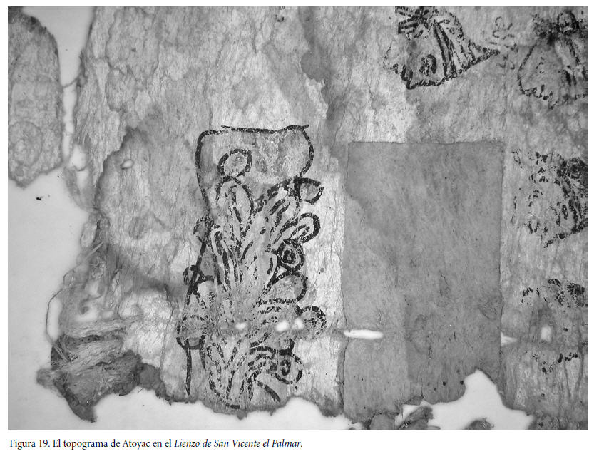 Concluyo, entonces, que el Mapa núm. 36 y el Lienzo Mixteco III representan al señorío de Atoyac y no al de Huajuapan, como pensó Smith. De nuevo vemos que la orientación de los documentos es con el oriente hacia arriba. En la parte inferior de los mapas se ve un río que atraviesa los documentos de derecha a izquierda. Su curso y dirección coinciden perfectamente con el río Mixteco, que pasa al poniente de Atoyac con una orientación sur-norte (mapa 4, p. XX). De hecho, la ubicación del topograma de Atoyac en el Lienzo de San Vicente el Palmar coincide con la ubicación del río. Aparte de representar el nombre de San Pedro Atoyac, este topónimo también representa el nombre del río Mixteco (yuta cahnu - 'río grande'; atoyac - 'en el río') (fig. 19).