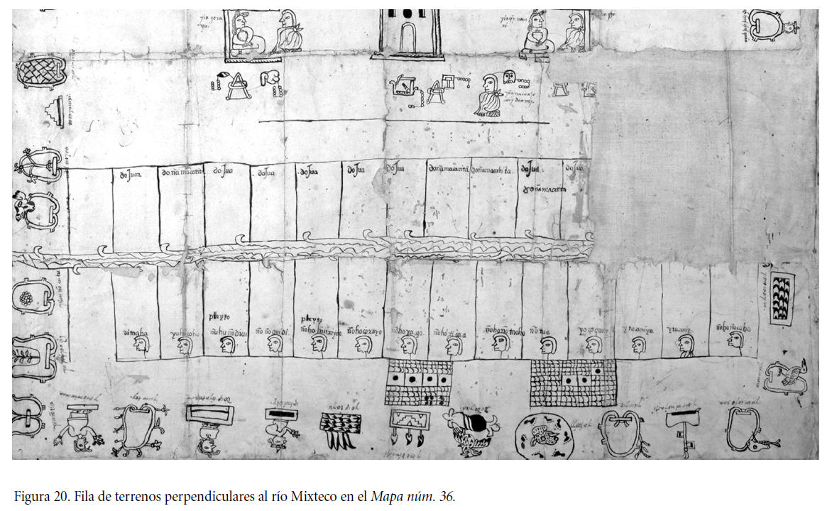No obstante lo anterior, el Mapa núm. 36 y el Lienzo Mixteco III no representan el mismo asunto: en el Mapa núm. 36, en las orillas del río está representada una fila de terrenos divididos por el río mismo y perpendiculares a él45. Estos terrenos estarían en lo que es el fértil llano de Atoyac, donde se abre la sierra de la Mixteca Baja en un extenso valle que permite la siembra de riego (figs. 20 y 21, p. 117). Como ya observó Smith, la mayoría de los terrenos tienen inscrito el nombre de don Juan, pero otros llevan el nombre de doña Macarita, y uno tiene ambos nombres46. Este don Juan es probablemente el mismo que el don Juan representado en el Lienzo de San Vicente el Palmar y doña Margarita podría ser su hermana u otro pariente cercano47. Estos terrenos de riego representan probablemente tierras patrimoniales de la casa real de Atoyac. En dos terrenos aparece la palabra pleyto, lo que indica que el documento pudo ser compuesto durante un conflicto por estas tierras productivas. Smith (1973: 200) leyó en uno de los terrenos el nombre ñodiai, el cual interpretó como otra referencia al nombre de Huajuapan (Ñuudzai en la variante de Teposcolula). Sin embargo, el original dice ñodicu (ñuudzico en la variante de Teposcolula). Desafortunadamente no he podido encontrar documentación alfabética relacionada con este tema.
