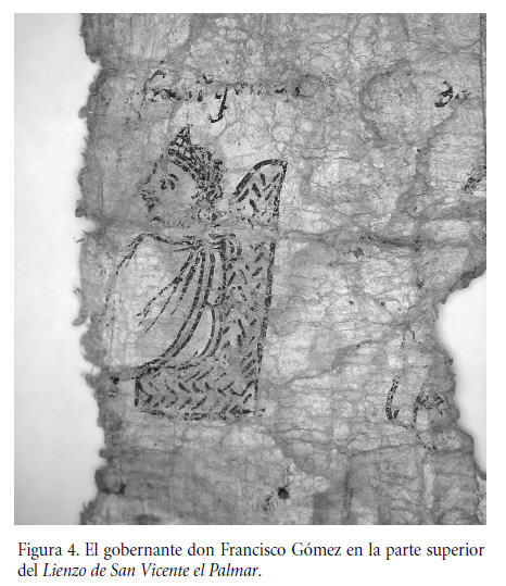 Queda ahora la pregunta: ¿cómo llegó un documento de Ihualtepec-Atoyac a San Vicente el Palmar? La respuesta podría estar en la historia tardía del cacicazgo de Ihualtepec. En el siglo XVIII, la cacica doña Lucía de Terrazas de Ihualtepec obtuvo, gracias a una herencia que le había llegado a su esposo, las tierras del pueblo de San Vicente, 'de la jurisdicción de Tonalá', probablemente el actual San Vicente el Palmar42. A partir de este momento, las tierras de San Vicente formaron parte del cacicazgo de Ihualtepec. El Lienzo y algunas copias de documentos de doña Lucía de Terrazas, que ahora están en el pueblo, pueden haber llegado por este camino43.