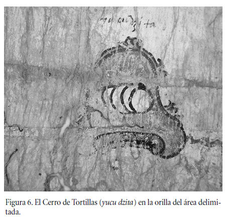 Estas áreas separadas están limitadas, sobre todo en sus esquinas, por plantas y árboles en lugar de topogramas, lo que sugiere que se trata de unidades territoriales muy locales: en documentos coloniales de los pueblos indígenas de Oaxaca y aún hoy en día es común referirse a ciertas plantas, arbustos o árboles sobresalientes en el paisaje para demarcar terrenos. Desafortunadamente, estas plantas no nos pueden ayudar a identificar las zonas delimitadas. Sin embargo, entre las plantas, magueyes y nopales aparece también un topograma con características específicas, el cual representa un cerro con tortillas en su interior y que lleva la glosa yucu dzita ('cerro de tortillas') (fig. 6).