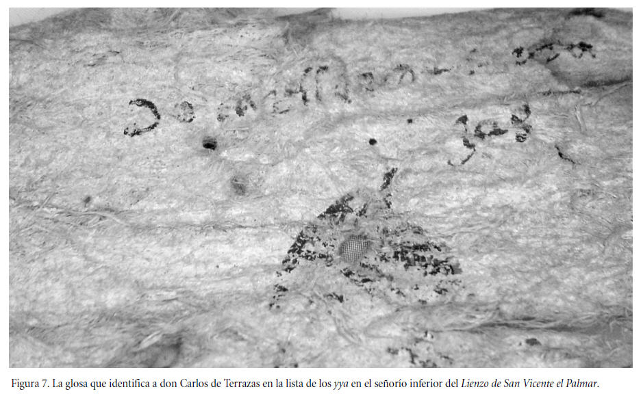 Arriba del gobernante que encabeza el linaje de gobernantes en la parte inferior del lienzo se distingue una glosa muy destruida que dice do ca(rllos) de terrazas (fig. 7). Este apellido poco común perteneció al linaje de los caciques de Yoaltepec (hoy San Juan Ihualtepec) desde mediados del siglo XVI hasta bien entrado el XIX27. El nombre Carlos corresponde a un gobernante del cacicazgo de Ihualtepec activo en la segunda mitad del siglo XVI y que aparece en varios documentos del Archivo General de la Nación28 y en la llamada Genealogía de Igualtepec de 1578, ya mencionada más arriba. Por lo tanto, parto ahora de la hipótesis de que el Lienzo de San Vicente el Palmar representa, en su mitad inferior, al señorío de Ihualtepec, y no a Tonalá, como pensó Smith.