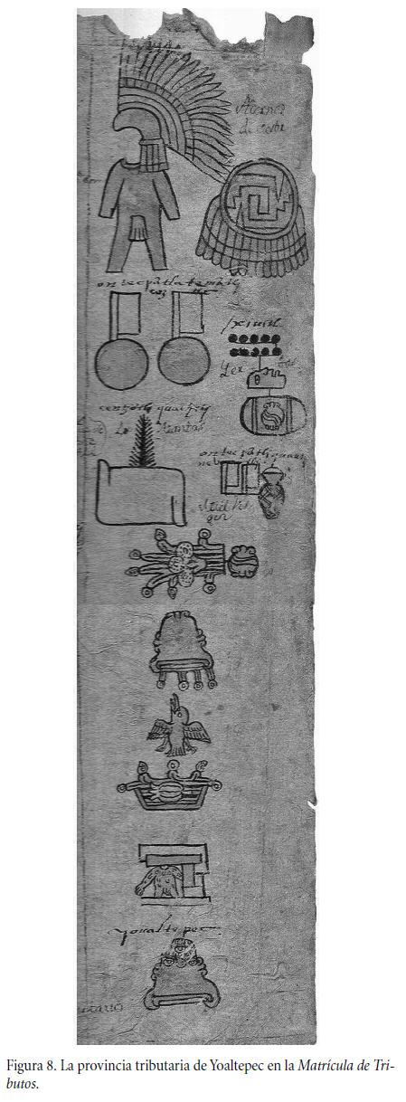 Durante la época Posclásica Yoaltepec era un señorío de importancia. Según fuentes mexicas, fue conquistado durante el reinado de Moctezuma I (1440-1464)29. La Matrícula de Tributos menciona Yoaltepec como cabecera de una pequeña provincia tributaria (fig. 8). Distintas fuentes del siglo XVI sugieren que el señorío entidad distinta a la provincia tributaria o, por lo menos, el área de su jurisdicción, era grande. Un documento de finales del siglo XVI (1598) enumera "los pueblos de la cabecera de Ygualtepec"30. Los he puesto en un mapa para indicar el territorio cubierto por estos pueblos (mapa 2, p. 106)31.