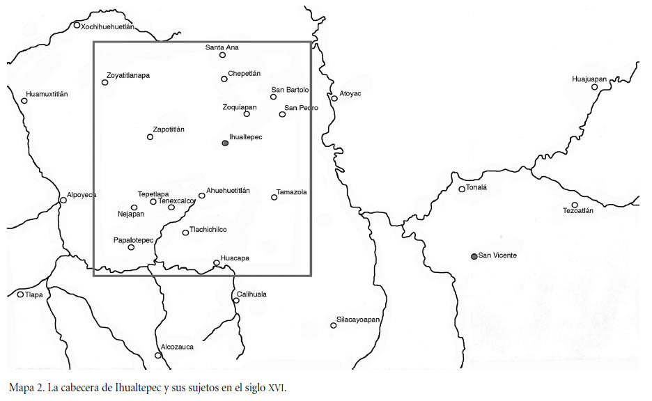 Los distintos documentos comentados en este trabajo están relacionados con los señoríos de Ihualtepec, Tonalá y Atoyac en la parte occidental de la Mixteca Baja. Cubren un área que hasta hoy quedó en blanco en el mapa etnohistórico de Oaxaca, pero que conforma el punto de contacto entre la Mixteca Alta, la región de Tlapa (o Tlachinollan) en Guerrero y la región de Acatlán en Puebla50.