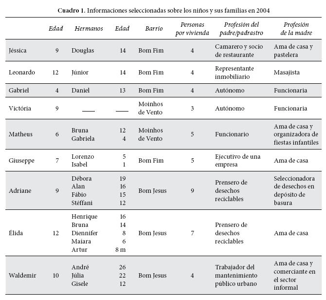 En el barrio bom Fim, donde viví entre 2003 y 2006, conocí a Jéssica (nueve años, 2004), leonardo (12 años, 2004), Gabriel (cuatro años, 2004) y Giuseppe (siete años, 2004). Victória (nueve años, 2004) fue compañera de la hija de una amiga personal en un colegio y sugerida por ella. la misma amiga me presentó a la propietaria del colegio, quien me facilitó el contacto con Matheus (seis años, 2004). las niñas Adriane (nueve años, 2004) y Élida (12 años, 2004) fueron recomendadas por una líder comunitaria en el barrio bom Jesus, quienes me sugirieron también a Waldemir (10 años, 2004). Estos hechos me permitieron organizar a los niños en tres grupos según el barrio. El cuadro 1 sintetiza alguna información sobre los niños y sus familias. Es importante señalar que la familia es la institución que más aparece en las fotografías y los relatos de los niños, aunque en ningún momento se haya orientado la atención de los niños hacia esta dimensión en sus vidas. Esta categoría no fue pensada previamente, pero requirió de análisis por la cantidad de fotos que hacían referencia a la familia, a los familiares y al complejo contenido de las conversaciones posteriores. En este sentido, la familia juega un papel de referencia, siendo una categoría clave en esta investigación.