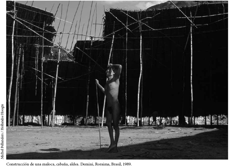 Construcción de una maloca, cabaña, aldea. Demini, Roraima, Brasil, 1989.