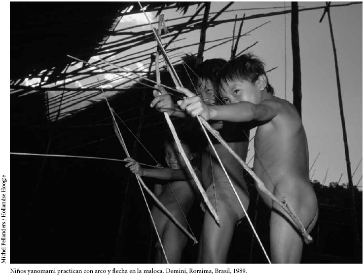 Niños yanomami practican con arco y flecha en la maloca. Demini, Roraima, Brasil, 1989.