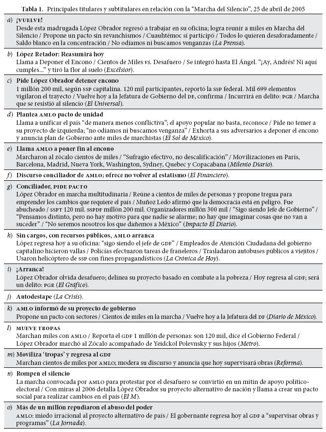 Se analizan los titulares y subtitulares de la primera plana de 15 periódicos mexicanos publicados el 25 de abril de 2005, el día siguiente de la "Marcha del Silencio" en la ciudad de México, en la que casi 1 200 000 manifestantes protestaron contra el desafuero del jefe de gobierno capitalino Andrés Manuel López Obrador. El análisis del material lingüístico de los titulares permitió advertir si la prensa consideró más relevante la celebración de la marcha o si destacó a un protagonista individual. Los resultados muestran que la mayoría de la prensa no estaba preparada para dar relevancia al sentido democrático de la marcha y optó por resaltar el sentido electoral del episodio, que a la postre se convertiría en uno de los primeros capítulos de la polémica contienda por la presidencia en 2006.