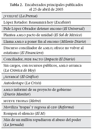 En los titulares del 25 de abril de 2005 la prensa mexicana destacaba dos grandes temas en los que reconocía a los protagonistas más visibles del evento del día anterior: la marcha y Andrés Manuel López Obrador. El primero, un protagonista colectivo conformado por los cientos de miles de personas que se habían dado cita en el centro de la ciudad de México para manifestarse pacíficamente. En relación con la marcha, los titulares de prensa destacaban tres temas: el número de participantes, el objetivo de la movilización y el reconocimiento individual de algunos de los manifestantes. El segundo, un protagonista individual, que encarnaba el motivo de la manifestación ciudadana, un turbio proceso de desafuero al que López Obrador había sido sometido durante meses, respecto del cual se aludía a tres temas: su retorno a la jefatura de Gobierno del Distrito Federal, el lanzamiento de facto de su candidatura para contender como candidato del Partido de la Revolución Democrática a la presidencia de la república en las elecciones de 2006 y su actitud ante el enrarecido clima político que en esos momentos se vivía en el país.