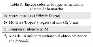 Las formas lingüísticas y la selección léxica de los verbos utilizados en estos titulares y subtitulares son significativas. Los tres primeros aluden, aunque de manera distinta, al objetivo que animaba la marcha: el rechazo al proceso de desafuero. La Jornada fue el único rotativo que en su titular principal expresó explícitamente el tema, para ello utilizó el verbo "repudiar". Excélsior optó por una forma latina ampliamente utilizada para expresar la relación de oposición: "Cientos de Miles vs. Desafuero". Milenio Diario introduce una cita directa que recoge una de las consignas que se dejaron oír en la marcha: "Sufragio efectivo, no descalificación", actualización del lema de campaña de Francisco I. Madero contra una nueva reelección de Porfirio Díaz: "Sufragio efectivo, no reelección". Esta frase constituye un doble reclamo al gobierno federal, expresado en dos partes: la primera es una forma afirmativa que manifiesta el requerimiento de que el gobierno federal respete la voluntad emitida por los ciudadanos mediante el voto, la segunda parte presenta una forma negativa mediante la cual la sociedad civil participante en la marcha pedía al gobierno federal parar la campaña de descalificación hacia AMLO y reconocer su derecho a contender por la presidencia de la república.