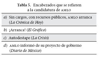 El tema de la candidatura, presente en cuatro titulares, también aparece cada vez de manera diferente. En la tabla 5 se pueden observar los titulares relacionados con este tema. En tres de las cuatro oraciones —5a, 5b y 5c— se alude a un inicio de facto de la campaña por la presidencia de la república para 2006 en términos de la práctica priista vigente hasta el 2000. En 5c se utiliza el término "autodestape", del que ya hemos hablado. En 5a y 5b se usa el verbo "arrancar", que se asocia a la "carrera presidencial". El 5 b no deja lugar a dudas de estar ante una expresión hípica que ubica al conjunto de los "presidenciables" en un ámbito fuertemente competitivo. La tradición política mexicana, en buena parte forjada en época priista, alude a ellos como "caballada", que puede estar, según la época, más o menos "flaca".