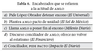 El tema de la actitud conciliadora mostrada por AMLO fue el que apareció con más frecuencia en los titulares de la prensa mexicana. En la tabla 6 se presentan los cinco enunciados con este tema. Dicha actitud se manifiesta en el llamado a detener el encono y el planteamiento de un pacto de unidad. El hecho de que éste fuera el tema destacado con mayor recurrencia en los titulares es un indicador de que esta actitud llamó fuertemente la atención de los reporteros porque era poco esperada. La noticia fue que AMLO no respondiera a tal encono con un llamado a los asistentes a la marcha para resistir de manera violenta al embate del que estaba siendo objeto por parte del gobierno federal.