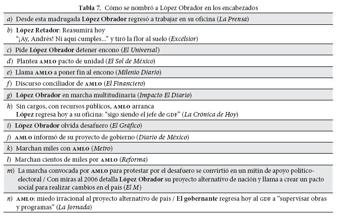 Sólo dos periódicos se apartan de este uso: el Excélsior (7b) —en cuyo titular se hace el juego de palabras "López Retador" al que aludimos en párrafos anteriores y que en un subtitular abre una cita directa en la que una "viejita" le nombra simplemente "Andrés"— y La Crónica de Hoy (7h) —se observa una variación interesante: mientras que en el titular se hace referencia al personaje como AMLO, en uno de los subtitulares se utiliza solamente el primer apellido "López"—. Esta última práctica, recuérdese, sería empleada durante la campaña presidencial de 2006 para referirse de manera peyorativa a este personaje. Precisamente La Crónica de Hoy fue el diario que introdujo en el clima informativo la tradición de referirse a este personaje sólo como "López" en una estrategia de descalificación de imagen cuyo uso se expandiría a otros medios y estaría presente en el discurso de algunos funcionarios del gobierno federal, como el vocero del gobierno foxista, Rubén Aguilar. En El M (7m) también se advierte una variación, en este caso, entre el uso del acrónimo y la referencia mediante los apellidos. En relación con López Obrador como actor, es interesante además observar la forma en que se codificó su participación en la marcha: