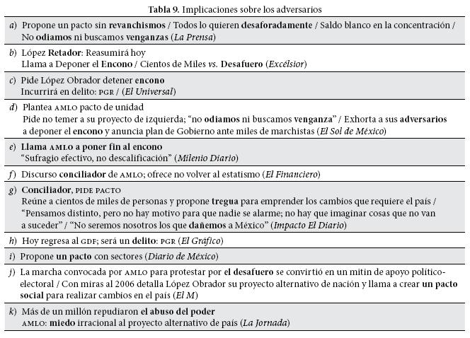 El silencio de los adversarios se complementa con el silencio sobre los adversarios. El discurso de los titulares de prensa construye un escenario en el que los adversarios, con excepción de la PGR, no se nombran explícitamente, aunque están ahí, como se advierte en la tabla 9.