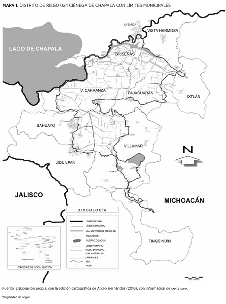El Distrito de Riego 024, estructurado en tres módulos de riego, agrupó en la década de 1990 a organizaciones ejidales y de pequeñas propiedades. En total son 46 organizaciones ejidales y 20 pequeñas propiedades, que a su vez se dividen en 249 potreros que abarcan el territorio parcial o total de nueve municipios: Villamar, Jiquilpan, Sahuayo, Venustiano Carranza, Briseñas, Pajacuarán, Vista Hermosa, Tingüindín e Ixtlán. En conjunto cubren una superficie de 59 119.69 ha (Conagua, 2005b: 2426). La región se organizó como un subespacio en una lógica global (Santos, 1996: 49), al formar parte de la región administrativa Lerma-Santiago-Pacífico.