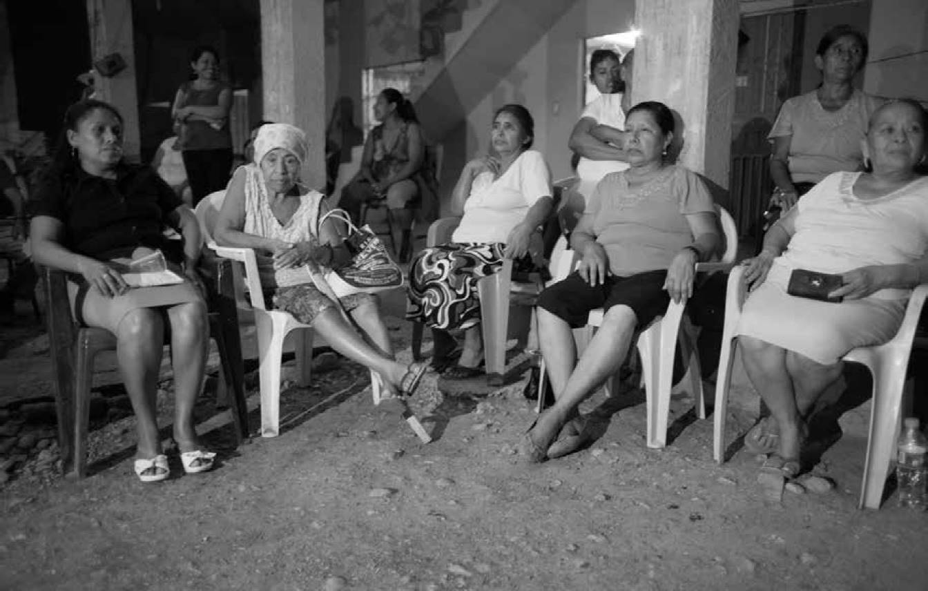 El encuentro para la conciliación se llevó a cabo un domingo por la mañana. En la mesa de la comisaría municipal había siete hombres representantes de las comunidades o barrios, y al centro estaba el comisariado ejidal. Nos sentamos en las bancas frente a ellos. De un lado estaban los hermanos de Bertha, su mamá y las integrantes del CDMCH; del otro lado, la cuñada, su esposo, el suegro y el abogado. Sentaron a Bertha y Francisco hasta adelante. El comisariado ejidal dijo por qué estábamos ahí. Mencionó que por esta vez dejarían que los abogados estuvieran presentes en la audiencia, pero que eso no era parte de su costumbre. Se le dio la palabra a Bertha, quien prefirió hablar en tseltal. Comenzó a narrar que el motivo de su separación era que Francisco la golpeaba y contó su historia, que ella y sus hijos vivían en la casa que su suegro les había regalado a ella y a su esposo el día de su boda, que era un pequeño cuarto, y con el tiempo habían trabajado para ampliarla y sembrar árboles. Dijo que se acercaba a ellos como autoridades porque sabía que cuando había un conflicto de violencia en la comunidad y los esposos se separaban, las mujeres podían quedarse en sus casas con sus hijos, por lo que no entendía por qué le querían quitar su casa.